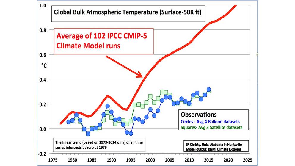 Ja, du läste faktiskt rätt. Men nu kanske någon vill opponera sig: Det här är ju verkligen inte vad vi dagligen får höra och läsa i vår media? Nej, det är det inte. Artikelförfattarna ger svaret på varför det är så: Diskussionerna i dag baserar sig inte på verkliga observationer utan på IPCC:s rapporter och deras klimatmodeller (den röda grafen på bilden). Därför skulle det vara så oerhört viktigt, igen enligt artikelförfattarna, att vi skulle hålla fast vid - och debatten basera sig på - den vetenskapliga metoden som innebär att teorier måste kunna styrkas av mätningar i verkligheten. Det stora problemet är nämligen att politikerna, om de låter sig vilseledas av IPCC:s felaktiga klimatmodeller, triggas att fatta förhastade och dåliga beslut om åtgärder som dels får förödande effekter för vår välfärd i I-länderna samt dels gör det omöjligt att bygga upp välfärden i jordens fattigare länder.
